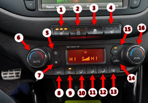 - دوگمەی ژمارە ١٦ ڕێگە بە سەرنشینی تەنیشت شۆفێرەکە دەدات کە پلەی گەرمی کۆنتڕۆڵ بکات کە تەنها ئاراستەی ئەو دەکرێت